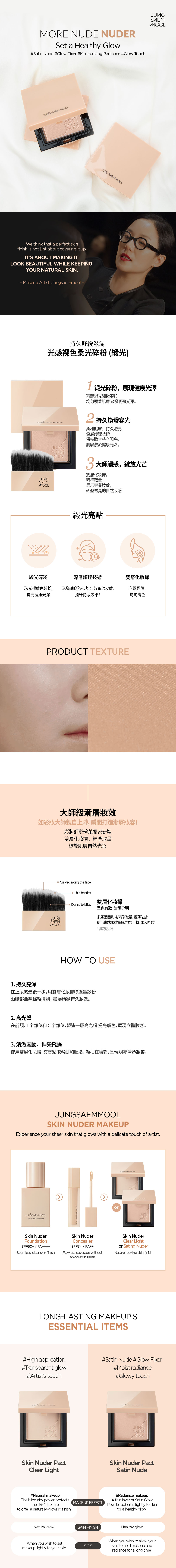 | 將內容物充分塗抹到雙層的兩側後,在膚色色板上均勻調整粉末量。從出油最多的T區開始,掃過眉毛、眼睛下方和眼瞼。最後掃過鼻子兩側(鼻樑)、人中和下巴。 | |